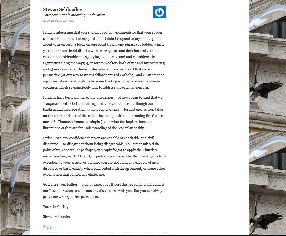 Fr. Byer did not approve that post as a reply to his blog. Instead he